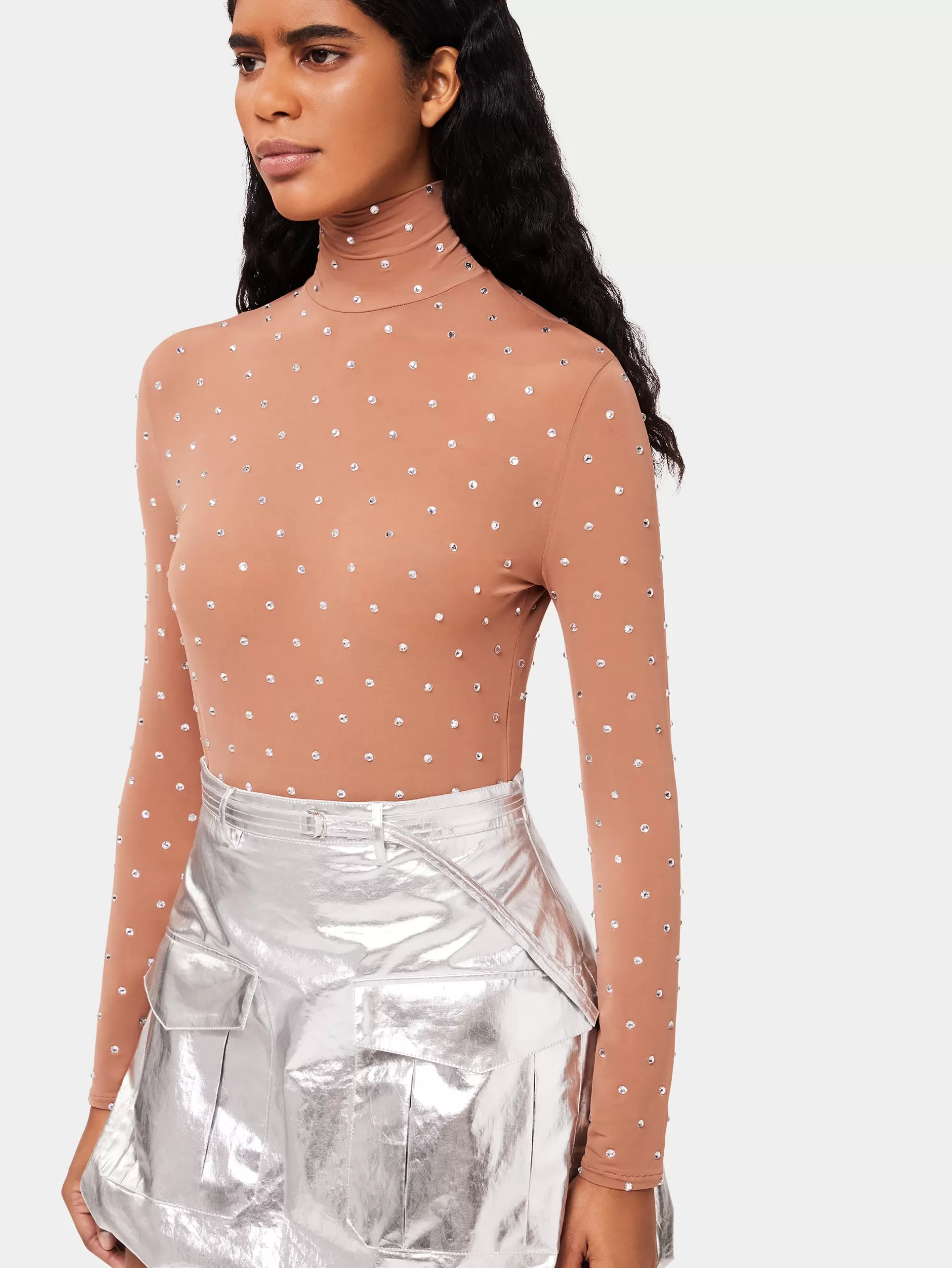 Colour : CaramelLong-sleevedCrystals-embellished topSecond skin effect