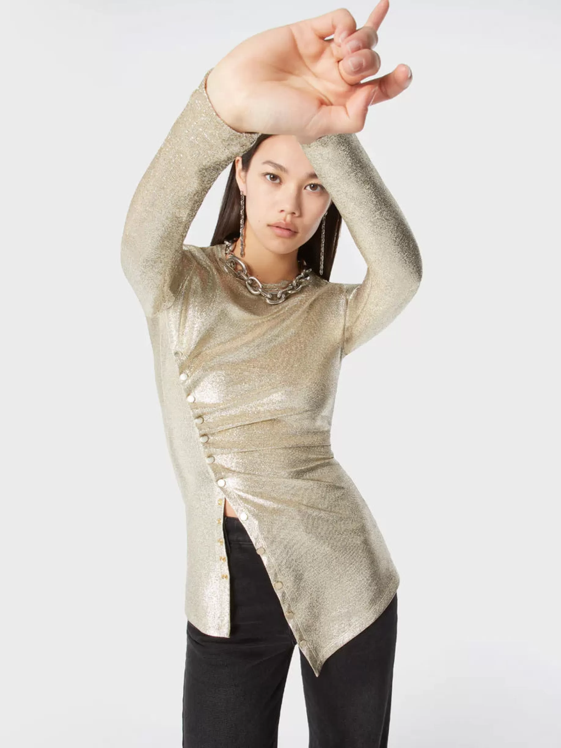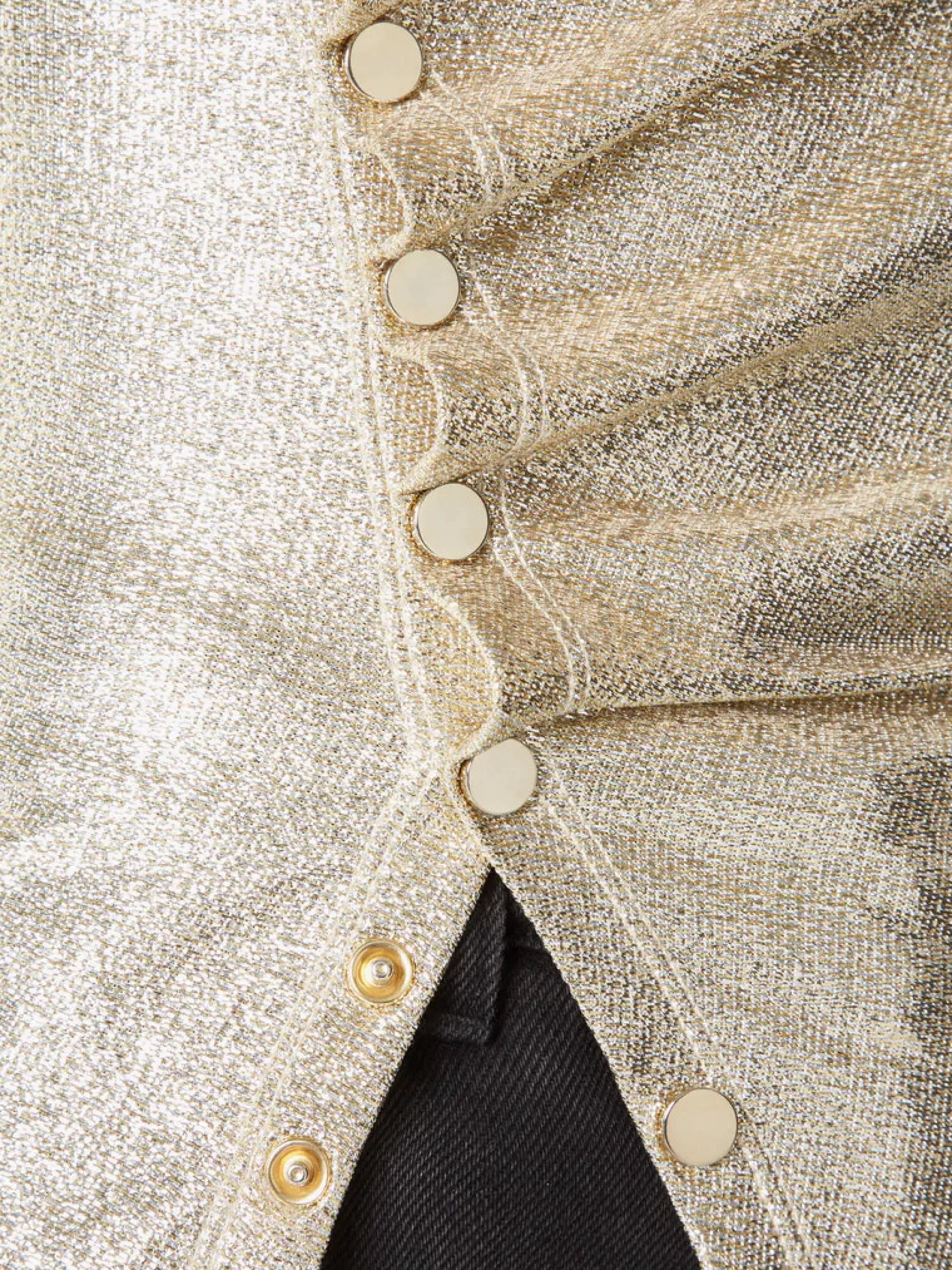 This long-sleeved piece, stylishly crafted in a fitted cut, is made of a light gold lurex jersey material. This timeless lurex top, from Maison Rabanne, closes on the side with a clean and minimalist line of silver snaps, for an elegant pleat. Drape this gold top casually or wear open as an overlay.