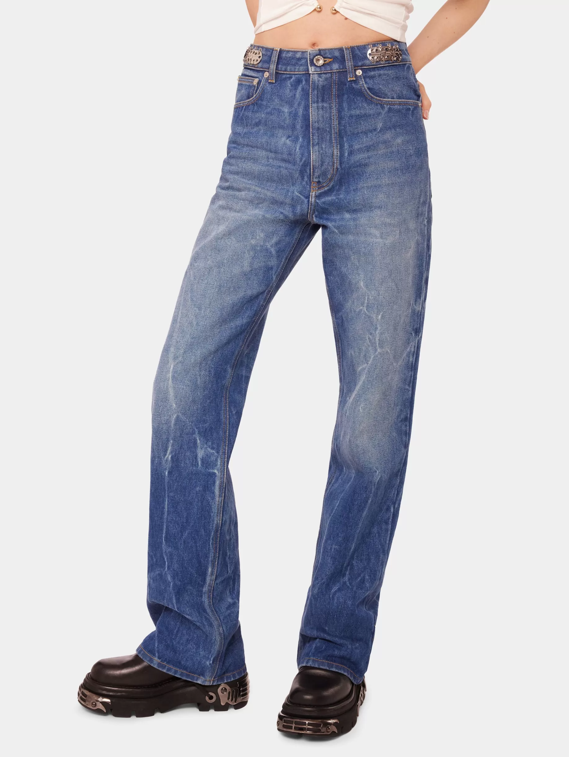 These high-waisted jeans with their metallic discs at the waist are a Maison Rabanne signature, making them a timeless piece. Ankle-flared and feminine.